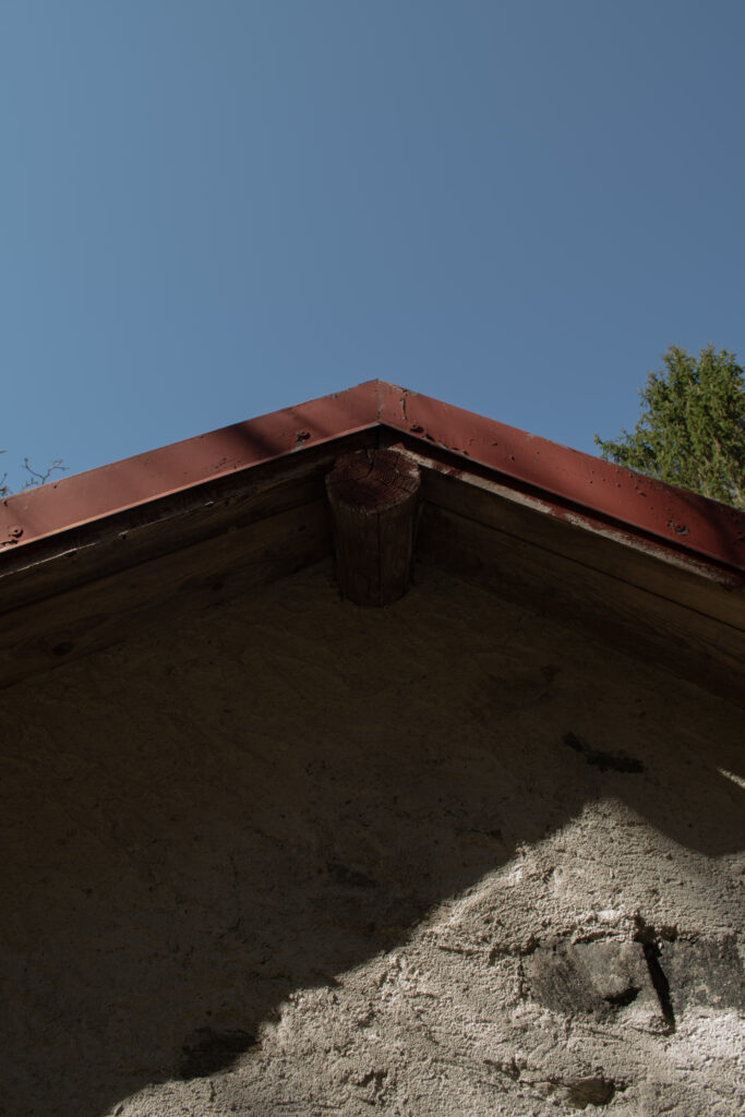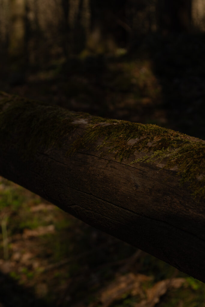 Il contrasto tra la corteccia scura e la freschezza del muschio che cresce sul legno.