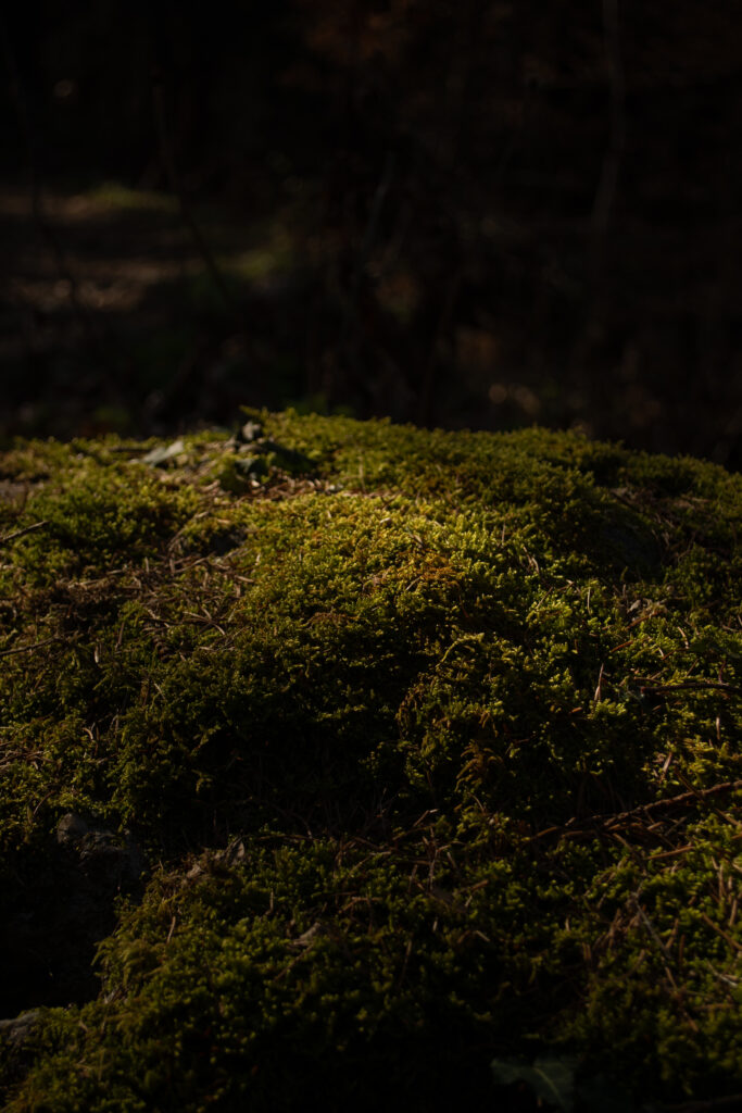 Uno scorcio suggestivo nel cuore del bosco, dove il verde del muschio e le ombre della vegetazione creano un’atmosfera di quiete e mistero.